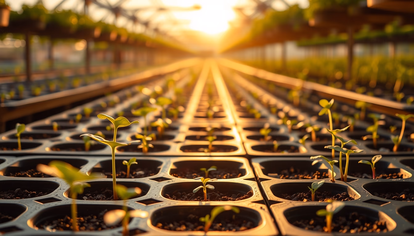 Editorial image of seedlings tray nursery, cinematic wide shot.