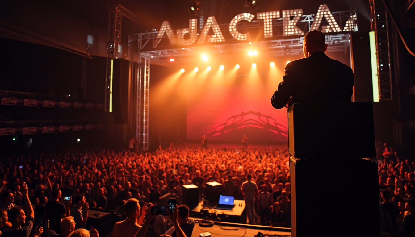 Editorial image of speaker stack rock concert, cinematic wide shot.