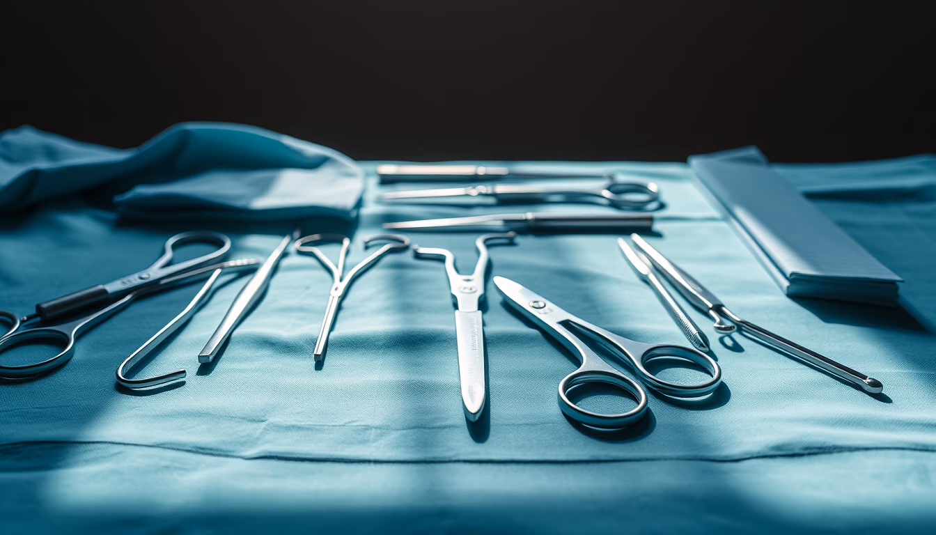 Editorial image of surgical instruments laid out sterile, minimalist composition.