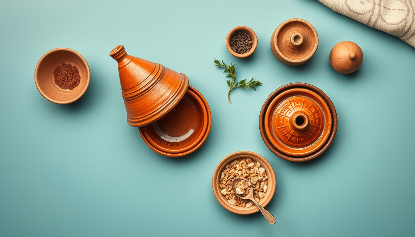 Editorial image of tagine moroccan clay, isometric flat lay.
