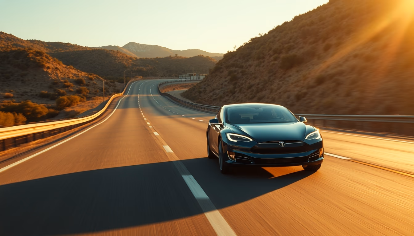 Editorial image of tesla model s on highway, cinematic wide shot.