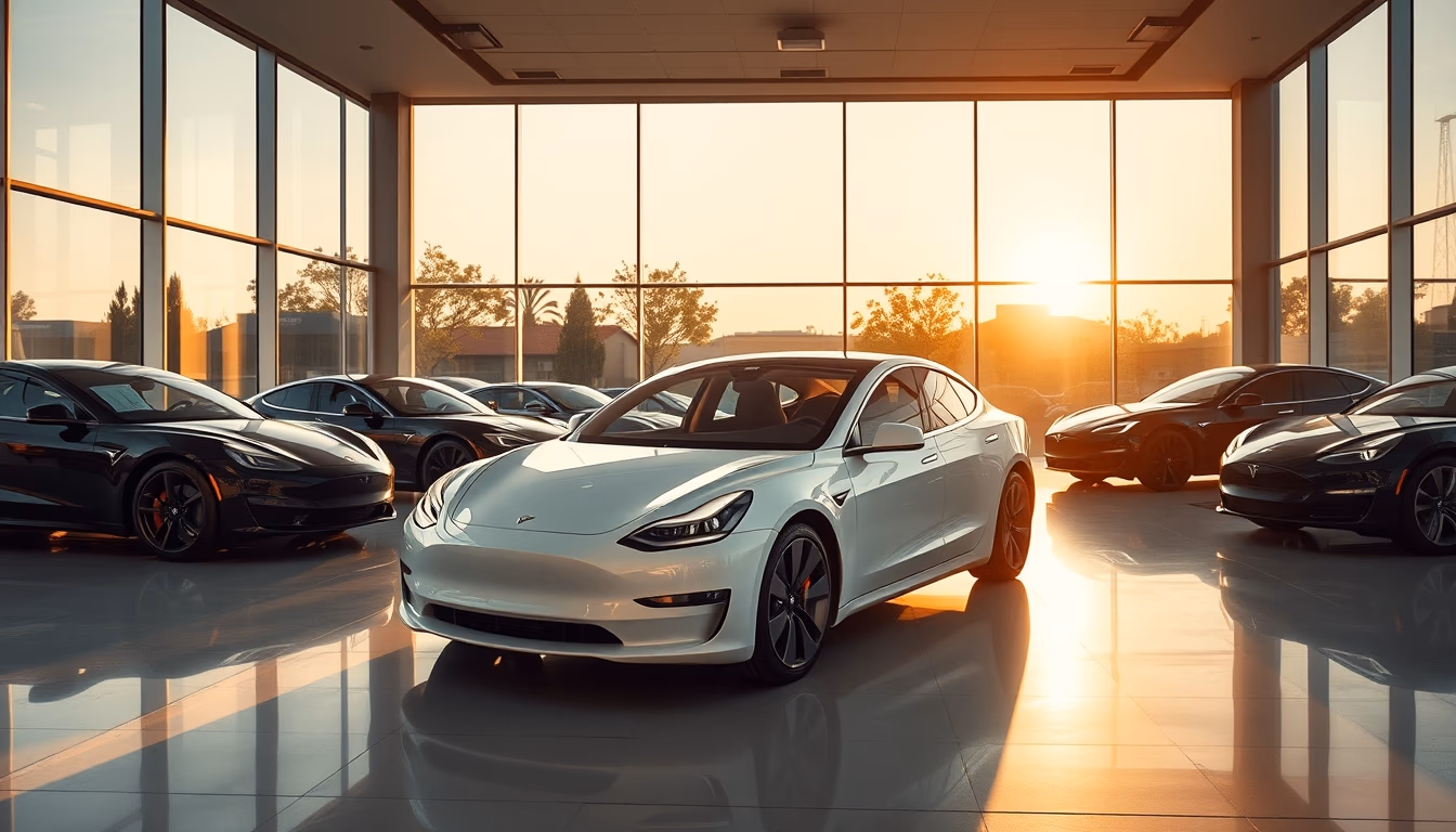 Editorial image of tesla model showroom, cinematic wide shot.