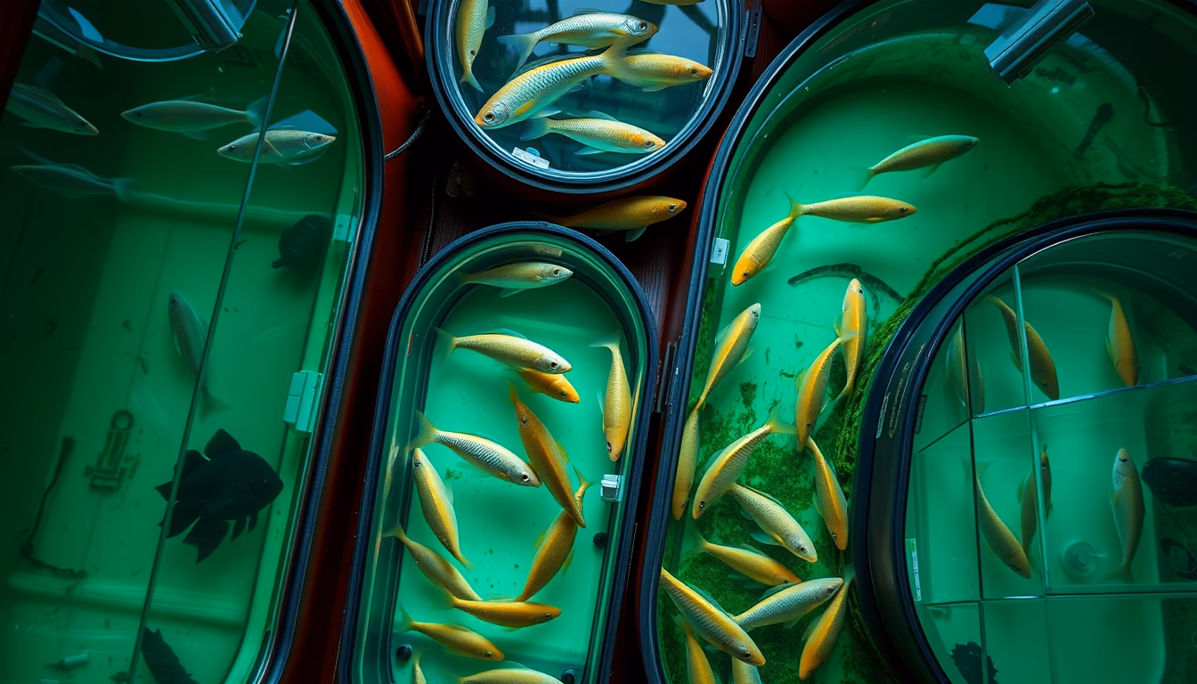 Editorial image of tilapia tanks indoor, isometric flat lay.
