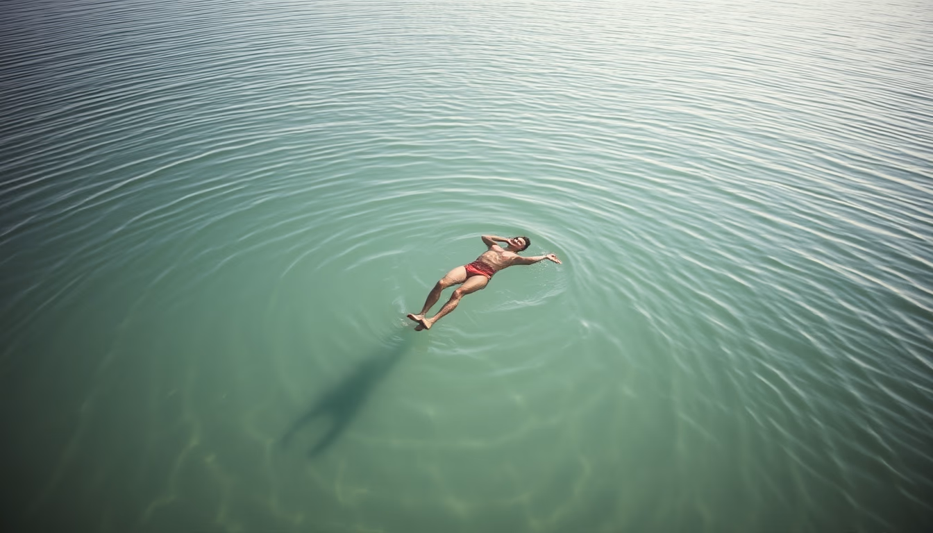 Imagem editorial de dead sea floating, minimalist composition.